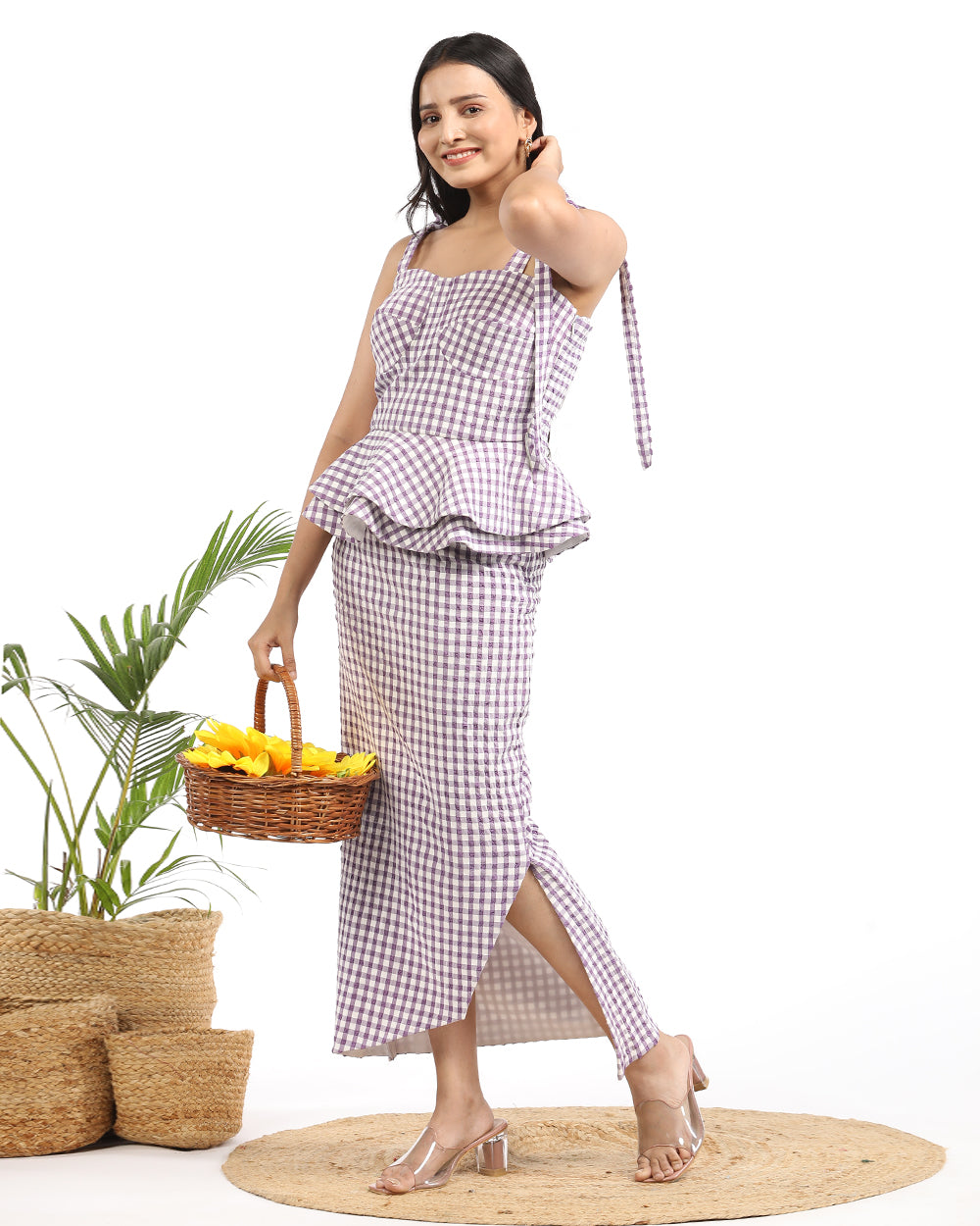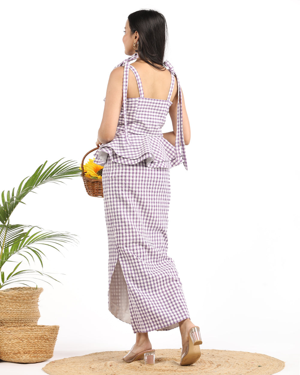 Genting cotton fabric. Gingham print. tieing straps. sweet heart neck. side zip closure. Purple